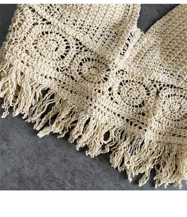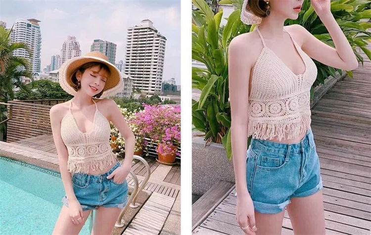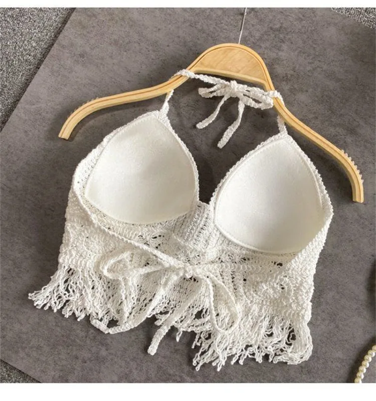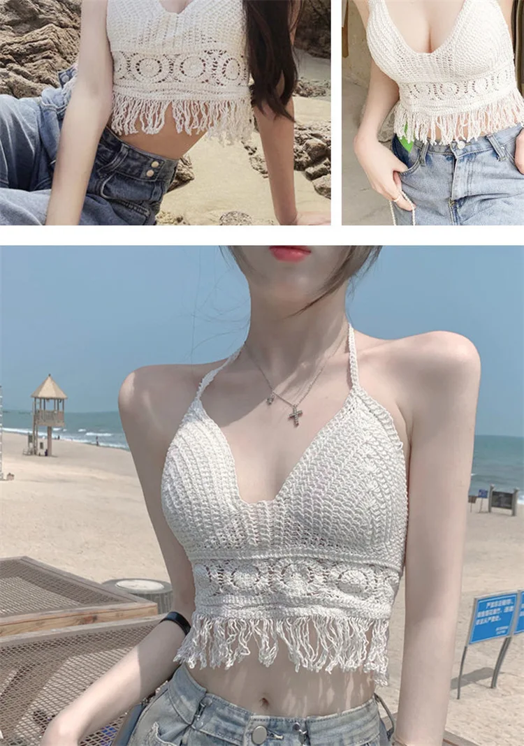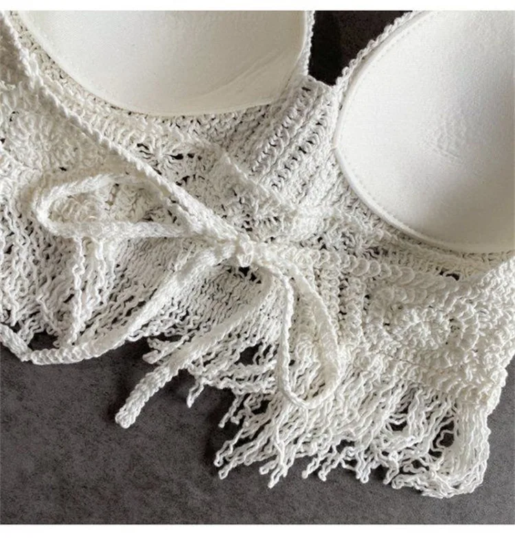 2) Estilo boêmio, padrão geométrico de colorblock de malha de crochê vazado, bainha com borlas, gravata nas costas.
